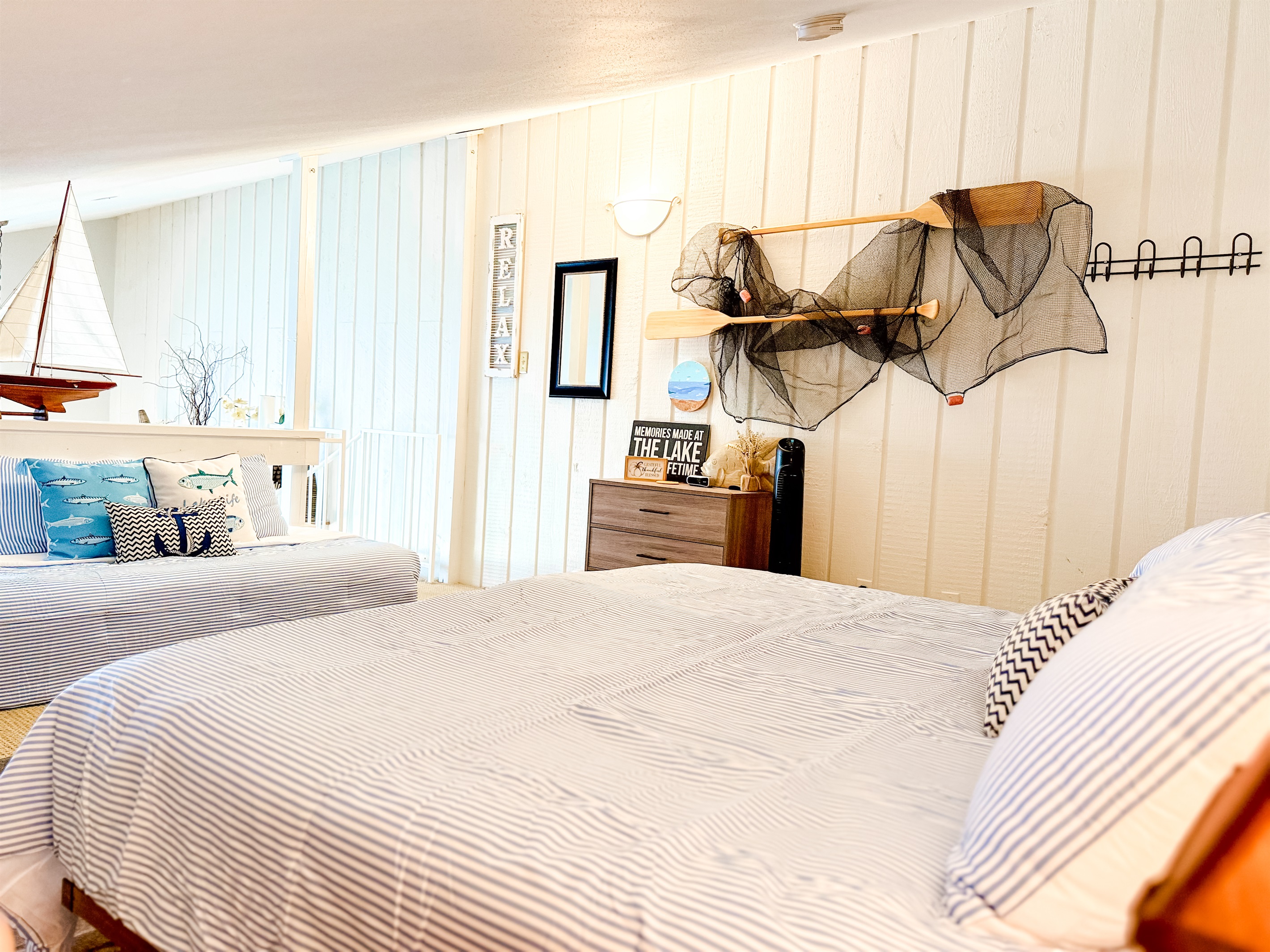 There is an office on the first floor with a day bed and pull out bed. The office space provides a work station with desk, desk chair, and dual screens for all your home office work needs. A beautifully decorated loft is located on the second floor for extra accommodations, with a king bed, and twin bed. The guest bedroom on the 1st floor boasts two full beds. We also have a Pack N Play available if needed, in the guest closet. Closets are available to hang clothes, in master bedroom and guest bedroom. Dressers are also available in every room. Smart TVs are available in every room with full cable, and all the major channels, using YouTube tv access, and Roku. Kitchen, laundry room, and bathrooms are fully stocked with essentials. Three Kayaks, two Stand Up Paddle Boards, and Lily pad float are also available. We also provide the following fishing equipment: fishing pole, and bait container. Life jackets available too! Per HOA regulationsâŚguests must launch and store boat and jet skis at public marina, which is 4 minutes away.